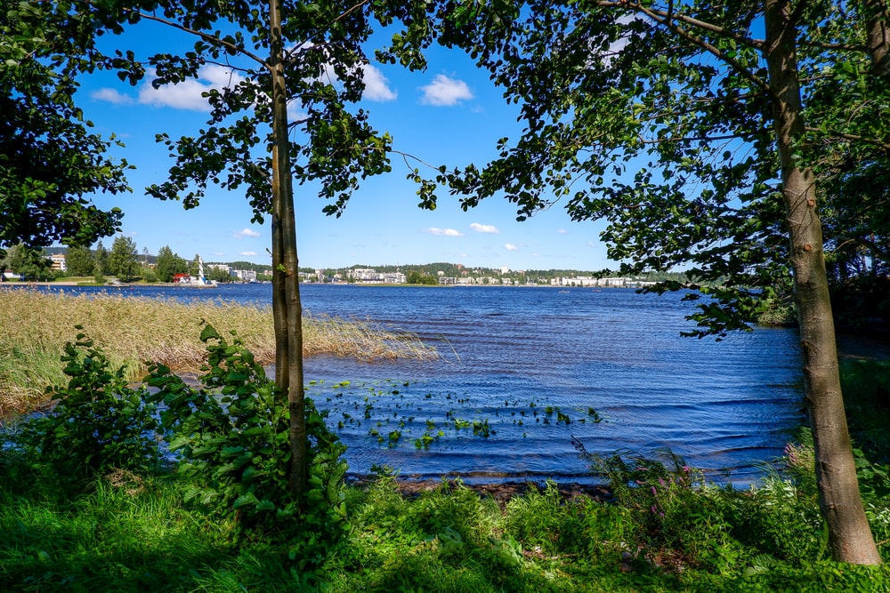 Tornista laskettelimme alas Kuopion torille. Vanhempani lähtivät torikierrokselle ja me miehen kanssa lähdimme katsomaan miltä Väinölänniemi näyttää. Kävelimmekin tuulisella niemellä pitkän kierroksen, rantaraitti oli oikein kaunis kuljettava eikä väkeäkään ollut paljoa liikkeellä. Uimarannoilla näytti olevan porukkaa monenlaisten liikuntalajien parissa, ja jopa melojia näkyi laineilla todella kovasta tuulesta huolimatta.