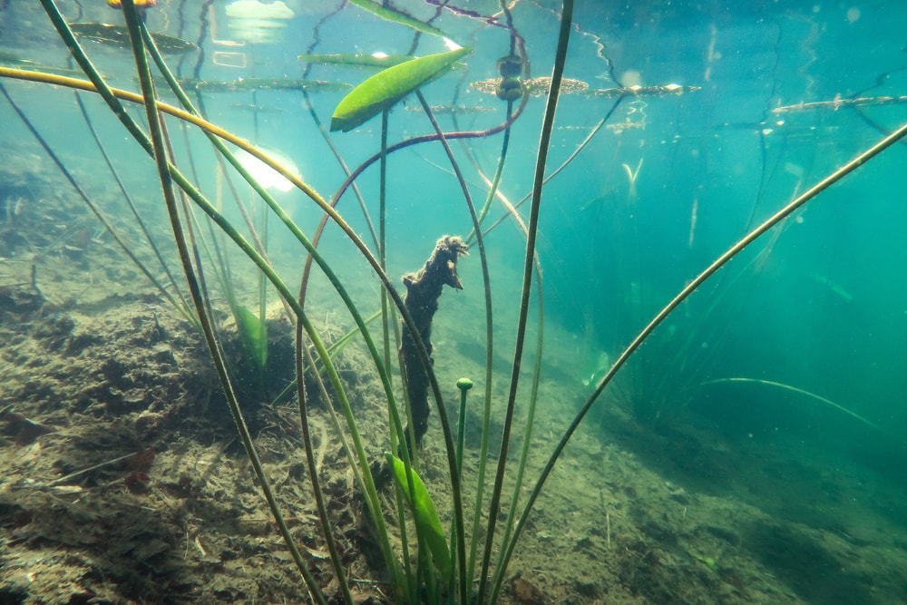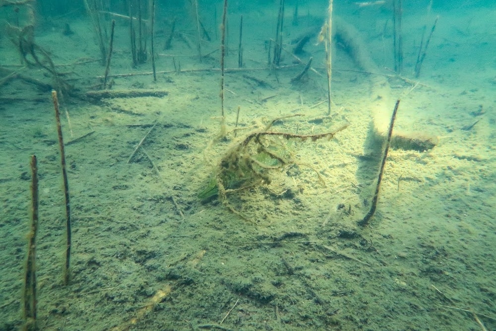 Vesi oli kirkasta, melkein turkoosia, ja siellä kasvoi rentukoita. Rentukat olivat mukava yllätys, ne tekivät muutoin melko tyhjästä maisemasta kauniin. Muutama irtonainen oksankarahka lepäsi pohjassa siellä täällä, mutta rentukat kasvoivat kauniina ryppäinä ja niiden lomassa oli hauska liikkua.