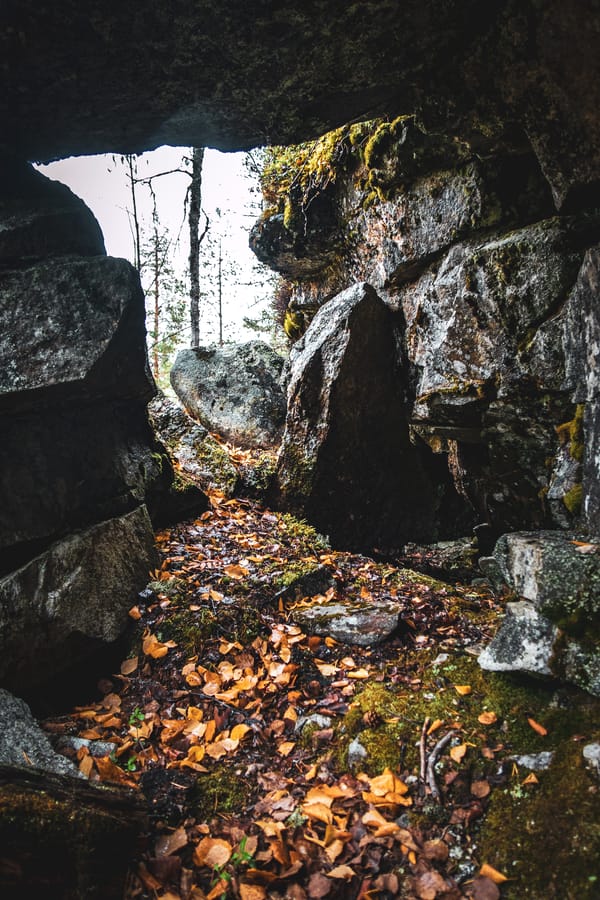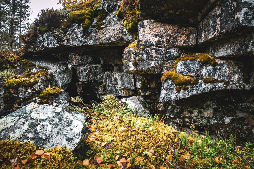 Vain muutaman askeleen jälkeen tulin maahisten kalliolle. Kalliot olivat hieman pelottava, synkkä näky luolineen ja onkaloineen, mutta onneksi kyltissä kerrottiin, että niissä elää oikein hyvä ja ystävällinen haltia, joten uskalsin mennä lähemmäs.