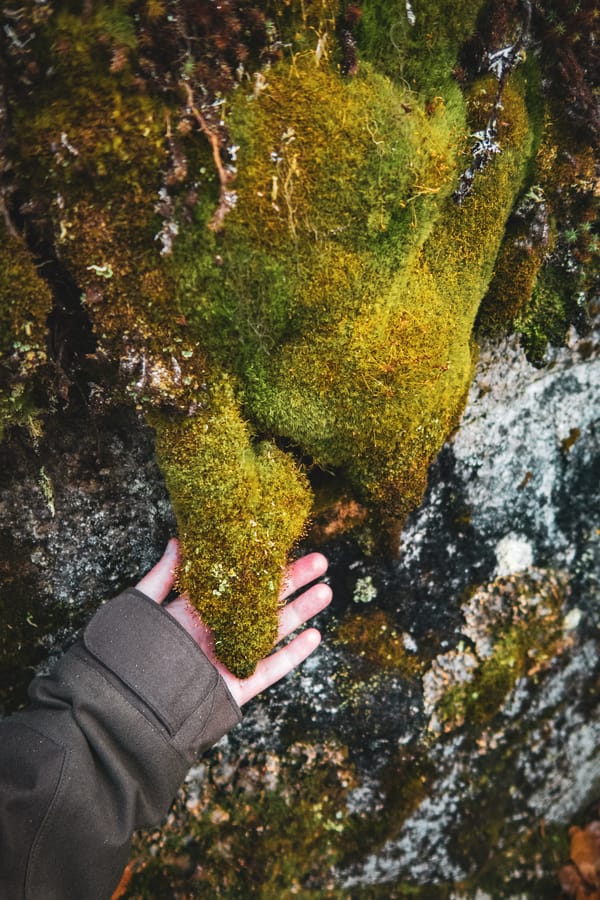 Tutkin kallion pintaa ja siinä eläviä olentoja pitkään. Mitä merkillisemmän näköisiä jäkäliä, puuhkeita sammalia, osa kuivaa, osa litimärkää, kaikki kaunista, kirjavaa ja monimuotoista. Vanhan metsän harmaa ja rosoinen kivisydän näytti puhkuvan elämää, eikä tiennyt mitään siitä, että olisi kohta aika panna talvilevolle. Vesipisarat tipahtelivat sammalia ja jäkäliä pitkin alas, missä toiset sammalet ja jäkälät ottivat ne vastaan yksi kerrallaan.