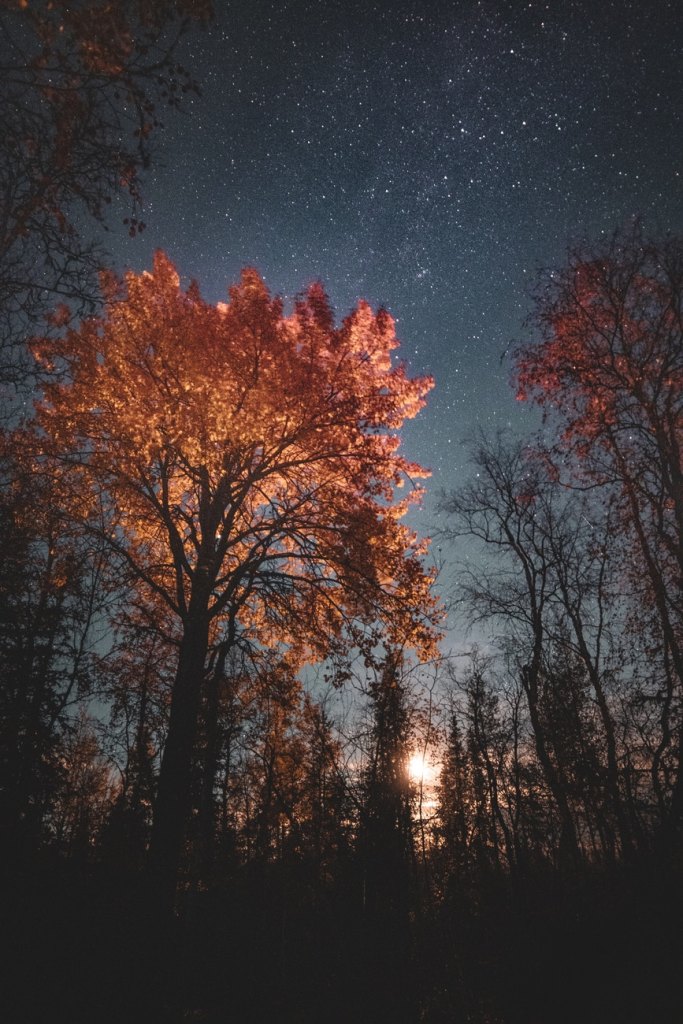 Juolahti mieleeni odottaa tähtien ilmestymistä ja palata sitten ottamaan haavasta kuva yhdessä tähtien kanssa. Halusin ikuistaa tämän Maa-planeetan elollisen yhdessä avaruuden kanssa, pienen osan avaruutta metsän muodossa ja taivaalla sen suuremman osan. Ajatella, että meidän planeettamme näyttää tältä! Täällä sitä vain tuuli suhisuttelee haavan keltaisia lehviä sinitaivaan alla, ja kääpä nauttii olostaan puunrungon syvässä vaossa, katsellen, kun ihmisolento sattuu paikalle puolukoita syömään ja kohta melkein liian liki tuijottamaan. Ei ole monella planeetalla tällaista menoa, ei ainakaan sikäli kun tunnemme.