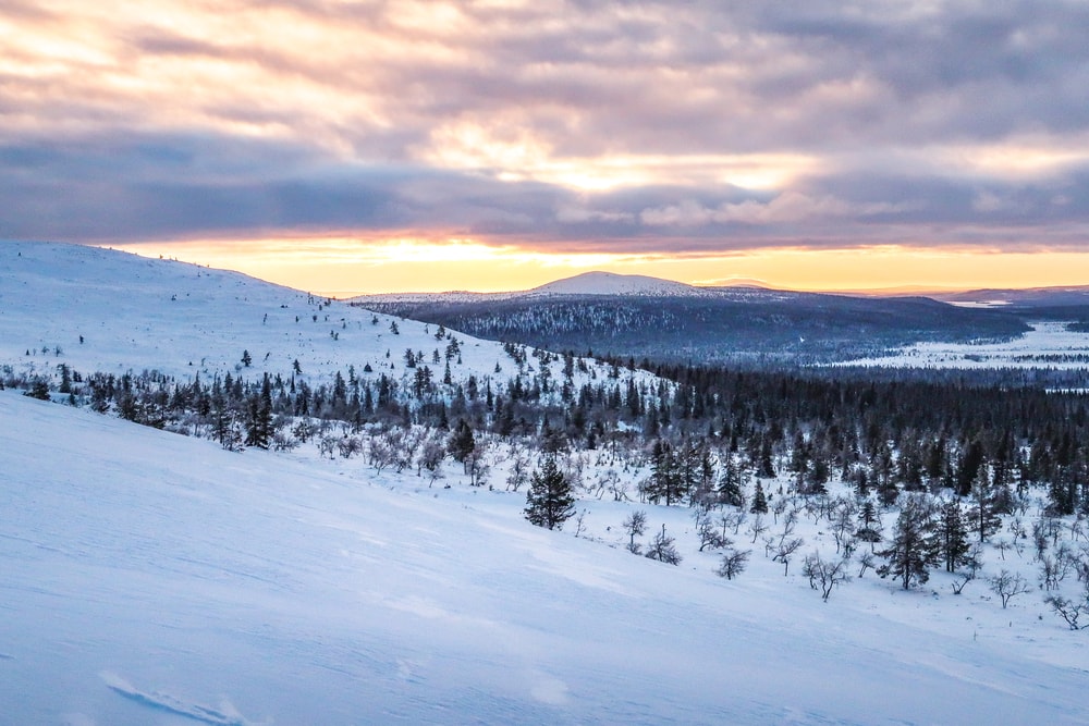 Kaarrettuamme takaisin kohti hotellia, kuljimme loppumatkan viiman puolella. Taivaskero oli melkein koko ajan harmauden piilottama, mutta tuli loppumatkasta näkyviin. Etelän suunnassa aurinko maalasi maiseman ja tunturijonon kauniin oransseiksi.