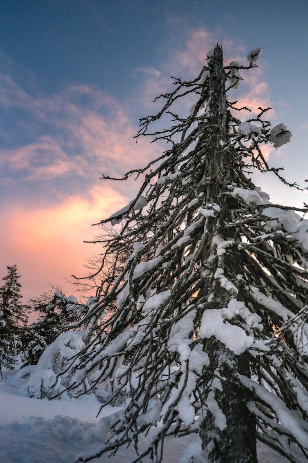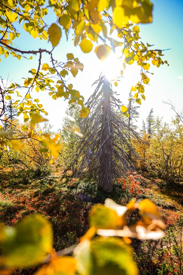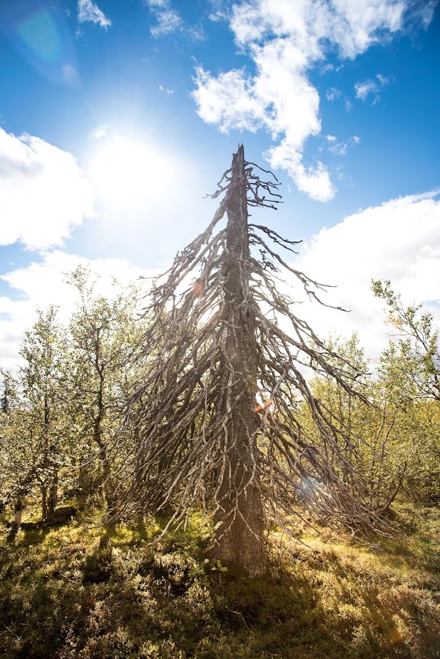 Saavuin lempikuuseni luo. Se on lempipuuni koko Lapissa, puu, johon ihastuin jo vuonna 2015, kun kävin täällä ensimmäisen kerran. Se on vankka kuusi, jolla on tavattoman tuuhea oksisto, vaikka sen latva on katkennut jo aikoja sitten. Minulle tästä puusta on tullut yksi Lapin tärkeimmistä ankkuripaikoista, paikka, jonne palatessaan mieli rauhoittuu ja tulee kotoisa ja turvallinen olo. Se on kuin vanha ystävä, jonka voi luottaa aina ole olevan siellä polun varrella.