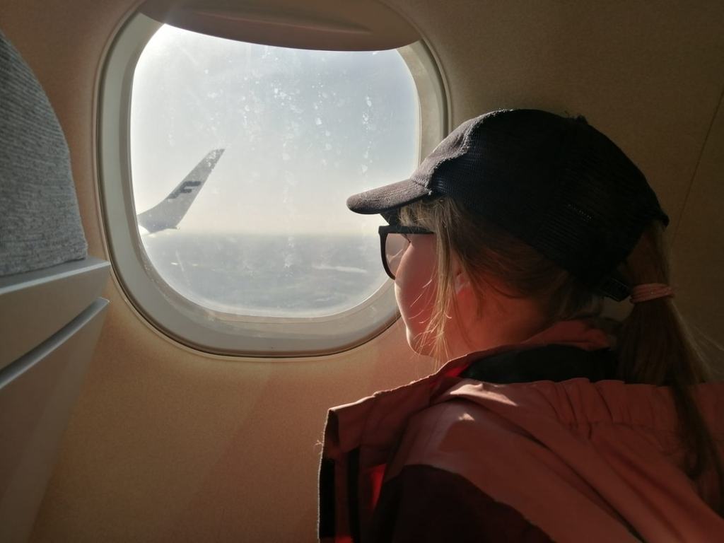 Sitten odottelin bussia, joka ei koskaan saapunut. Onneksi taksikoppi oli lähellä, otin sitten taksin lentokentälle. Olihan se messevää viimeisenä Lappi-päivänä ajella oikein taksilla kentälle ja ihailla ikkunasta sinistä valtavaa jokea ja Ounasvaaran siluettia, vaikka olisi niille rahoille kyllä parempaakin käyttöä ollut. Kentällä tapasin Joelin tyttären, jonka kanssa sitten lensimme yhdessä Helsinkiin. Hän ei ollut ennen lentänyt lentokoneella, joten hänen riemunsa ja jännityksensä vei hyvin oman huomioni pois siitä, että minä tosiaan lensin pois Lapista pelkällä menolipulla.