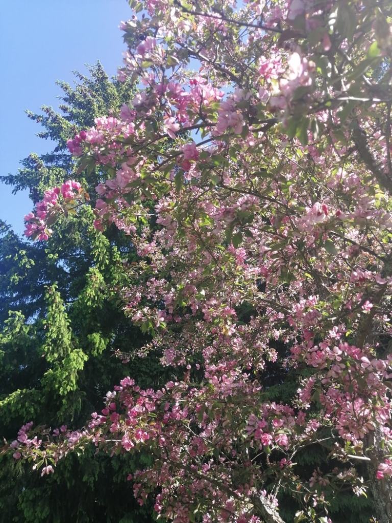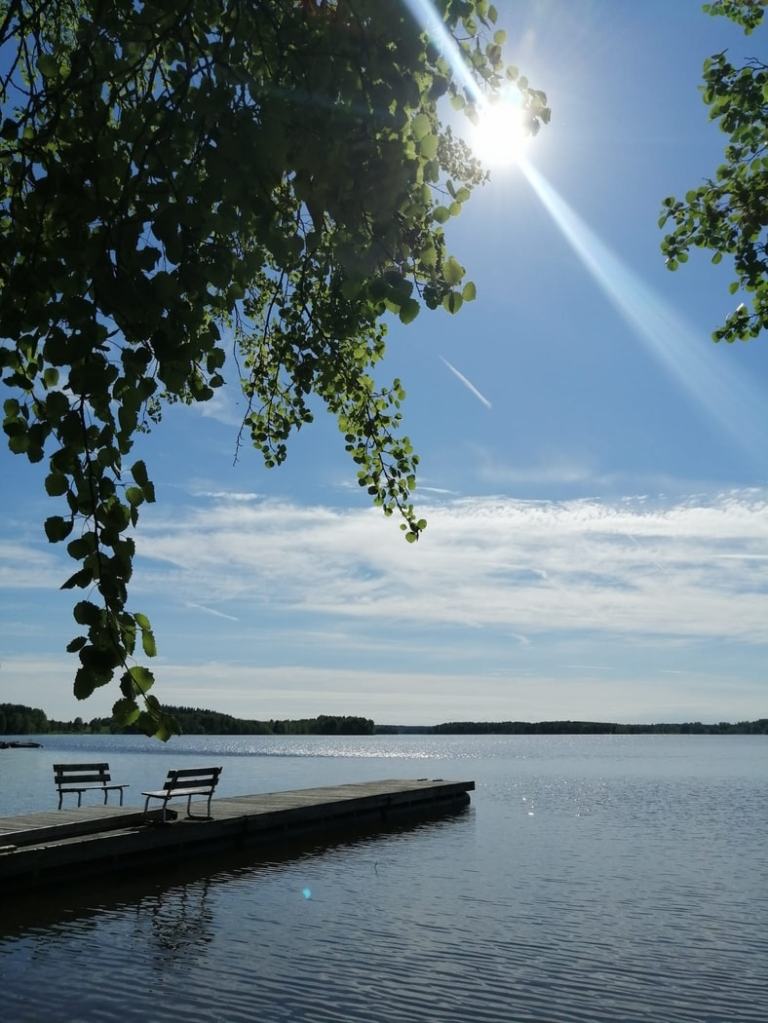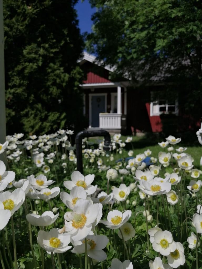 Kesä on vehreä kuin sadussa, puut kukkivat, lämmin ilma ympäröi ja suvituuli pitää hyvänä. Hoidetut, siistit pihapiirit ympäröivät kauniita vanhoja taloja, naapurit puuhastelevat omiaan, kyläläiset ulkoiluttavat koiriaan ja kaikki tuntuu olevan seesteistä. Vaahterat suhisevat (rakastan vaahteroita) ja tuomet ja syreenit tuoksuvat täydessä kukassa. Ihmiset vaikuttavat joka paikassa kamalan ystävällisiltä. Vieraat ihmiset ovat toivottaneet meitä tervetulleksi, ja kassalla mummo käytti monta sanaa kehuakseen nuoren kassan jouhevaa palvelua. Uimarannalla joukko poikia kannusti kaveriaan hyppäämään korkealta niin aidon hyväntahtoisesti, että se oli aivan liikuttavaa. Ja kun hän uskalsi hypätä, järven pintaa pitkin kiirivät varmasti monen mökin rantaan saakka huudot: Hienoa! Tosi hienoa! Sä teit sen!