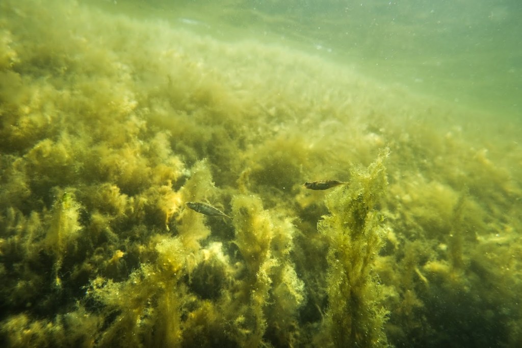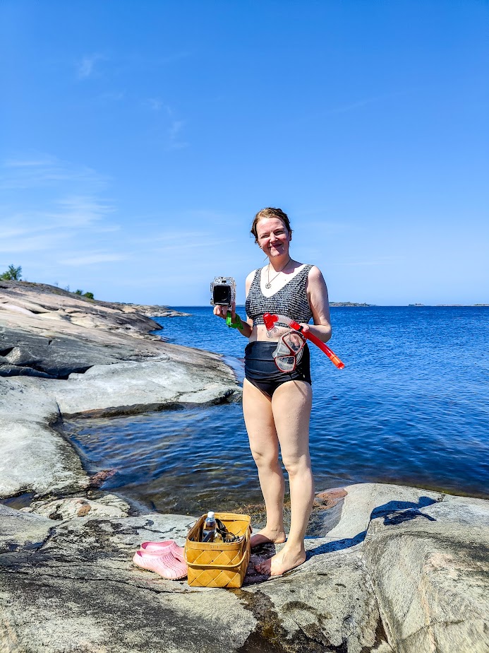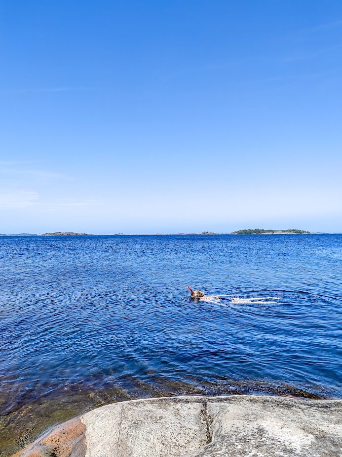 Ehdimme juuri ja juuri vaihtaa uimakamat päälle ennen kuin olimme jo vedessä. Saariston ihana, kirkas vesi paljasti huojuvat rakkolevät ja pikkukalat, kolmipiikit. Etsimme kalliorannalta turvallisen kohdan, josta pääsi sekä veteen että vedestä pois ilman liukastelua.