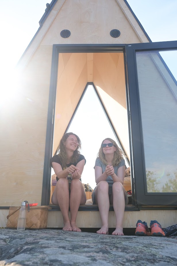Tyylikkään näköinen, pelkistetty mökki oli mielestäni hieno. Olen jo pitkään halunnut yöpyä sellaisessa. Mökin toinen pääty on yhtä suurta ikkunaa, josta aukesi ihana maisema suoraan saaristoon. Asetuimme taloksi ja pian mökki jo näyttikin siltä, kuin siinä olisi räjähtänyt tavarapommi.