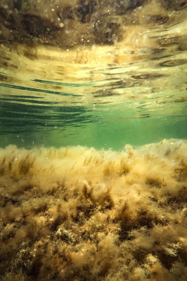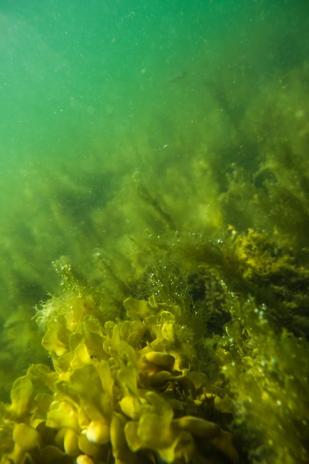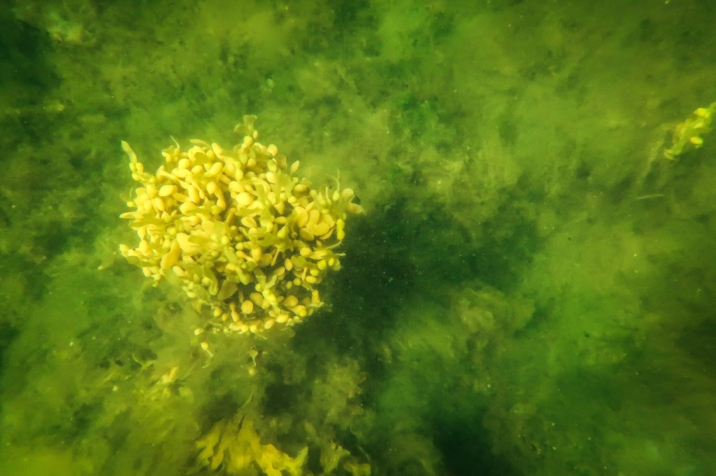 Rakkolevä kasvoi hienoina, hohtavankeltaisina kimppuina meren pohjassa. Kasvistossa ei näillä paikoin muuta kuvattavaa sitten oikein ollutkaan. Saaren toisella puolella olisi ollut jännittävämmän näköistä pohjamaisemaa, mutta siellä ei ollut oikein hyvää paikkaa mennä veteen, minkä lisäksi viereinen heinikkoinen kivikkoranta toi sen verran väkevästi käärmeet mieleen, etten siksikään halunnut lähteä sieltä yrittämään. Vaikka minulla ei ole mitään kyitä vastaan, niin toivon silti etten vedessä ollessa joutuisi kyytä kohtaamaan – se säikäyttäisi ehkä vähän turhan kovin, vaikka kyseessä varmasti olisi todellisuudessa vaaraton tilanne.