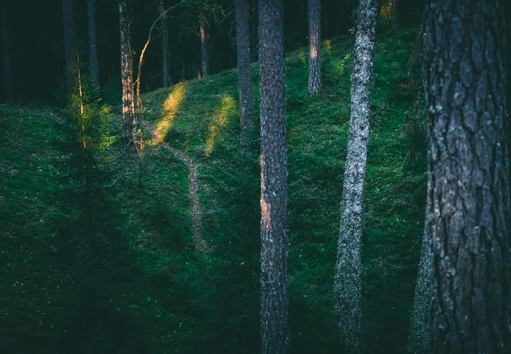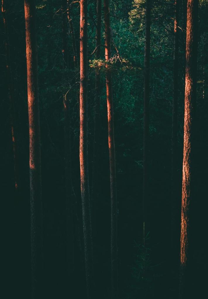 Ilta-aurinko ei ollut vielä laskemassa, mutta suuren harjun korkeat seinämät ja sen sylissä maan uumeniin asti ammottavat suppakuopat loivat hämärän viittaa meille, jotka matalina taivaisiin kurkottavien puiden keskellä talsimme neulaspolkua ja hengitimme havumetsän raikasta syysillan ilmaa. Varjo käänsi metsän vihreät sävyt siniseen, mutta ne harvat auringonsäteet, jotka pääsivät tavoittamaan mäntyjen oranssit rungot, saivat puut hohtamaan suorastaan tulenpalavina.