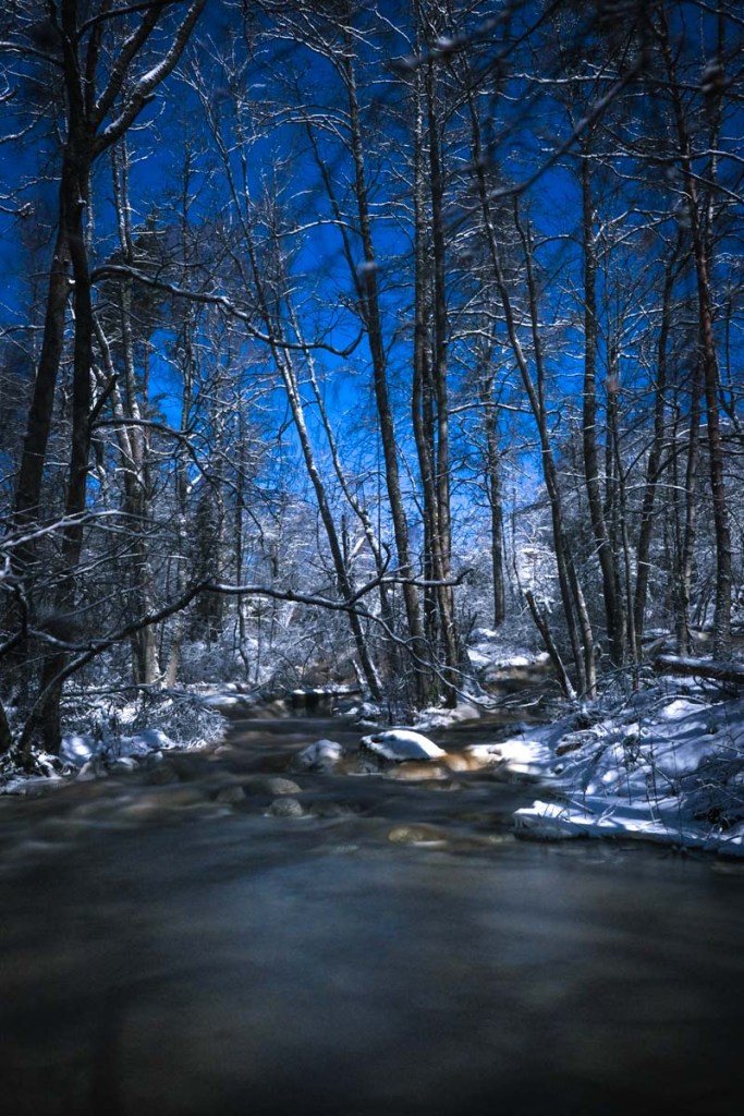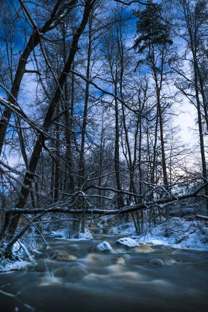 Pakkanen nipisteli sormia, sitä oli reilut kymmenen astetta. Muutoin olin osannut pukeutua, mutta luoja nähköön, etelän kosteassa talvessa -10 on takuulla kylmemmän tuntuinen kuin Lapissa. Aika kului kuitenkin joutuisaan. Vaihdoin välillä paikkaa, ja sillä aikaa kun kamera kuvasi, minä tungin sormet taskuihin lämpiämään ja katselin ohi juoksevaa veden virtaa sekä sitä, kuinka puiden pitkät, hontelot oksat, jotka kaartuivat kauas virran ylle, heiluivat hienoisesti.