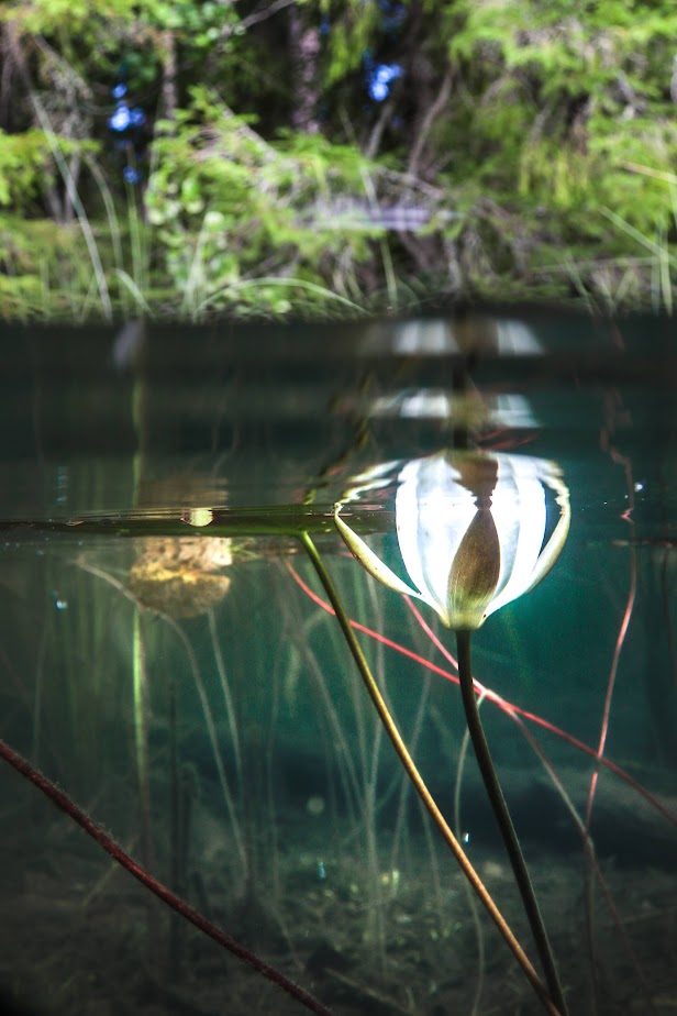 Höttöpohjasta kasvoi ulpukoita, ja muutamat hakopuut risteilivät siellä täällä. Snorklatessa on ehtinyt tottua siihen, ettei jalkoja yleensä voi laskea pohjaan kesken kaiken, sillö pohja on yleensä liian syvällä tai sitten muuten vain liian hankala liukkaiden puunrunkojen ja -oksien kudelma, johon ei tee mieli alkaa jalkoja sovitella. Tälläkään kierroksella ei olisi tullut mieleenkään kokeilla seistä, paitsi hetken aikaa seisoin erään tukinrungon päällä jotta sain vaihdettua muutaman sanan rannalle ilmestyneen mieheni kanssa (joka lopulta onneksi auttoi minut myös järvestä ylös, kun kerran pohjasta ei saanut ponnistettua).