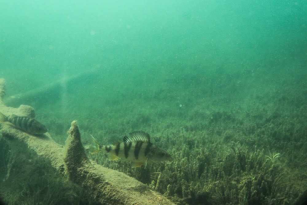 Vesi oli sameampaa kuin olin odottanut. Pieniä ahvenia risteili edessäni, ja ne sulautuivat lähes täydellisesti vaaleanvihreään maisemaan. Kaksi telkkää oli pesulla rantavedessä pienen matkan päässä. Yritin löytää haukea, mutta jälleen se jäi vain haaveeksi. Sen sijaan löysin jättiläisahvenen, joka lepäili puunrungon alla varjossa. Mahdollisesti suurin ahven mitä olen kuunaan veden alla nähnyt.