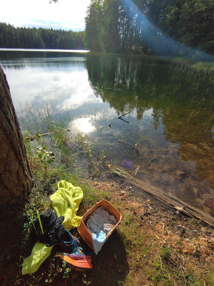 Toisella rannalla veteen oli helpompi mennä kunnon hiekkapohjaa pitkin, joten jätin uimatossut rannalle. Kuinka ihanaa onkaan uida jalat vapaina, kun välillä joutuu pitämään ahdistavia tossuja. Tossujen kanssa jalan potkukin tuntuu menettävän kaiken voimansa, siinä missä vapailla varpailla pääsee paljon paremmin eteenpäin, ja varpaiden välistä jokaisella potkulla puristuva järvivesi tuntuu ihanalta.