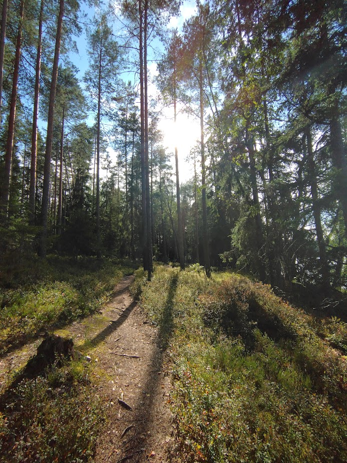 Nautin kulkiessa kesän lämmöstä ja loppukesäisen metsän tuoksuista, joita aurinko paahteellaan toi esiin. Kanerva tuoksui hunajalta ja kukki kauniin vaaleanpunaisena, polku rasahteli tossujen alla. Sieniä kasvoi siellä täällä, mutta ei mitään tutun näköistä. Oli lämmin ja hyvä kulkea, eikä ketään tullut vastaankaan.