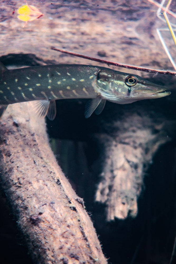Noin parisataa metriä myöhemmin löysin etsimäni. Suuri tukki makasi pitkittäin rannan mukaisesti niin, että sen alle muodostui suojaisa varjopaikka kaloille. Sen edustalla pieni hauki (alla kuvassa) katseli menoani, ahvenien sinkoillessa levottomasti ympärillä.