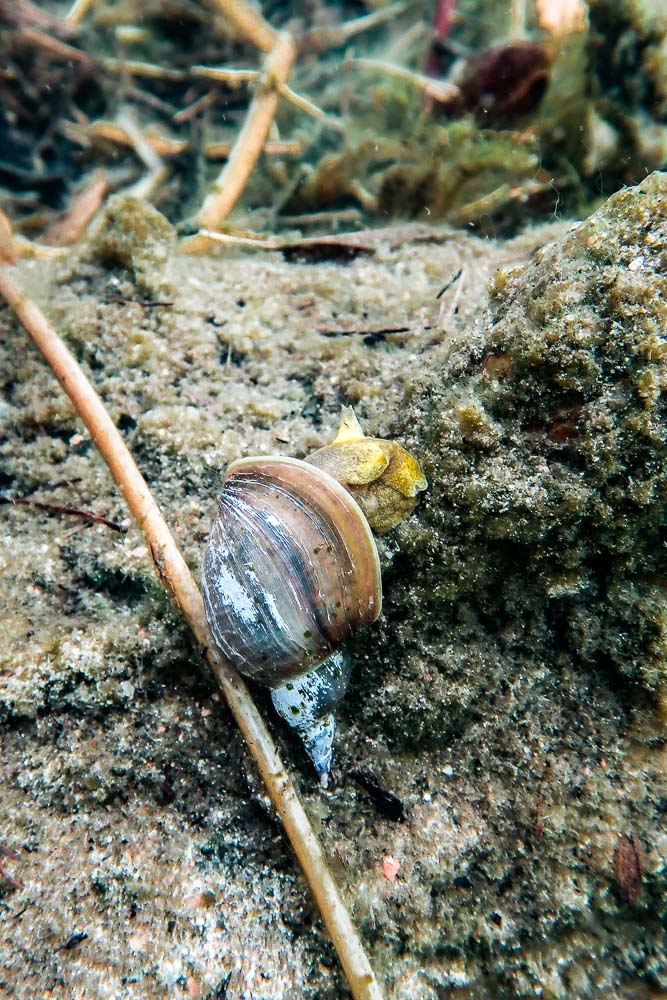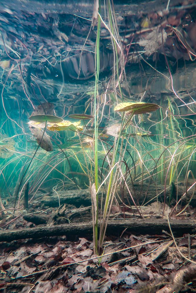 Puin uima-asun päälle ja astahdin kivelle, joka oli kuin suunniteltu askelma maan ja veden rajalla. Kurkkasin oikealle, jossa joidenkin metrien päässä kirkkaan veden lävitse erottui valkeana hiekkapohja. Muutenkin pohja näytti hyvältä, ei liikaa oksia, epätasaisuutta eikä terävän näköisiä kiviä, joten uimatossut saivat jäädä odottelemaan herkkutattien kanssa muovipussiin rannalle. Astuin veteen ja varovasti kuljin hiekkapohjalle. Vesi oli raikasta, mutta ei niin viileää, että se olisi tuntunut vaikealta. Asetin maskin naamalle ja pujotin kameran lenkin ranteen ympärille. Veteen pudottautuessani jyrkkä viileys kesti vain hetken, ja nopeasti sain hengityksen rauhoitettua päästäkseni mukavasti aloittamaan retken veden alla.