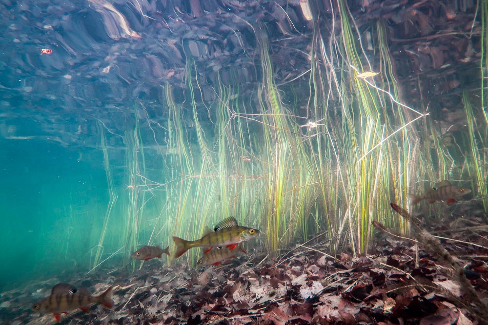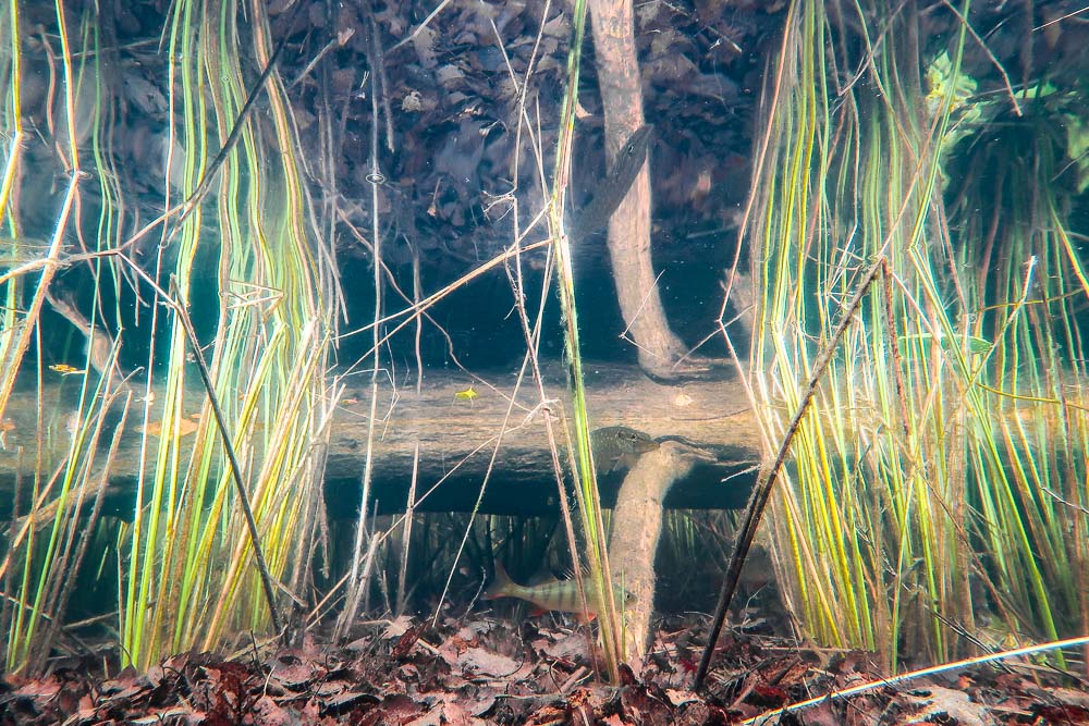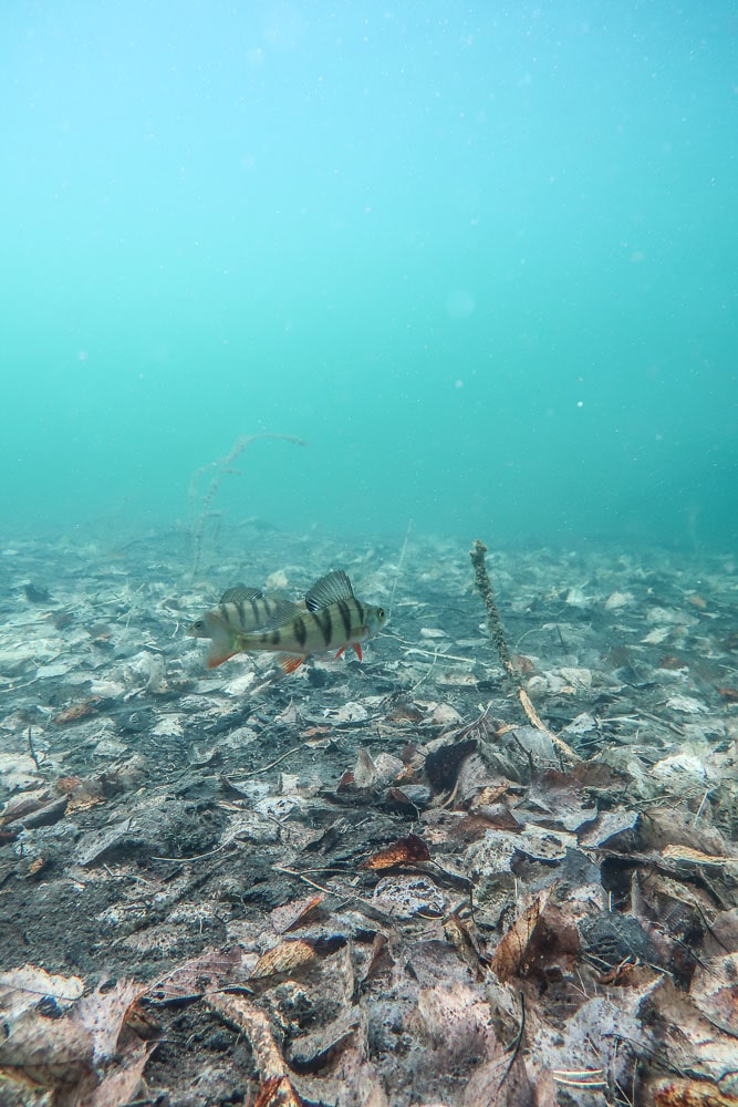 Pohjalla lepäsi paksu, harmaanruskea matto kuolleita lepän- ja koivunlehtiä. Niiden keskellä erilaiset puunrungot sojottivat sinne tänne, ja ahvenet poukkoilivat edelläni niiden yli ja ali. Koskaan ei Melkuttimella tarvitse edetä vedessä kauaa ennen kuin ahvenia ilmestyy ainakin muutamia. Tällä kertaa niitä kerääntyi lopulta sellainen 15–20 yksilön joukkio, suurin osa pieniä.