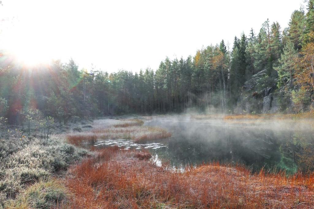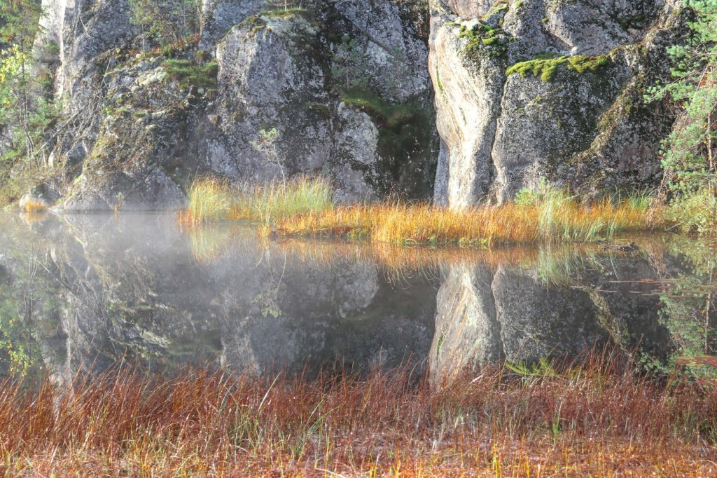Helvetinlammen rantakalliolla pysähdyimme. Lammen ylle oli nousemassa hento usva sitä mukaa, kun auringonsäteet pääsisivät siihen paremmin käsiksi. Ensin ne nostattaisivat usvan, ja sitten yhtäkkiä usva olisi tipotiessään.