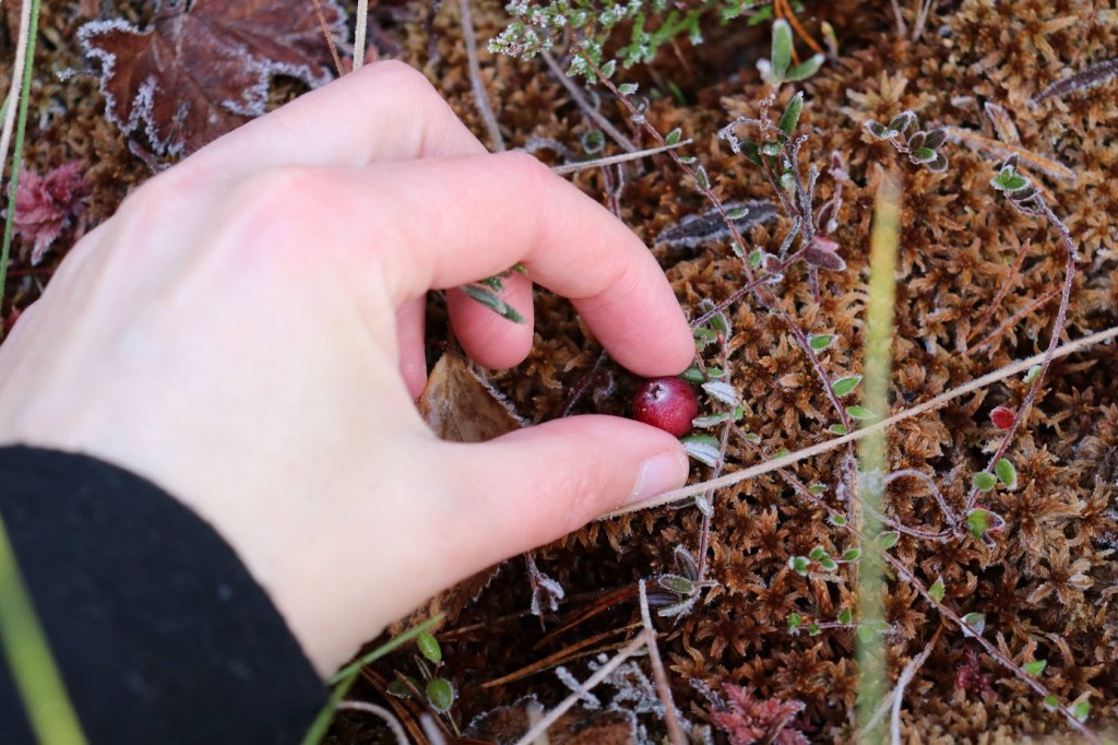 Laskeuduin lammen rantaan keräämään karpaloita. Marjat olivat yön jäljiltä umpijäässä. Poimin pienen pussillisen ja nautin lammenrannan kasvien värikirjosta. Sammaleet ja hillanlehdet olivat viininpunaisessa ja okraisessa ruskassa, ja pakkanen oli kirjoillut niille kaikille suloiset valkoiset pitsireunat.