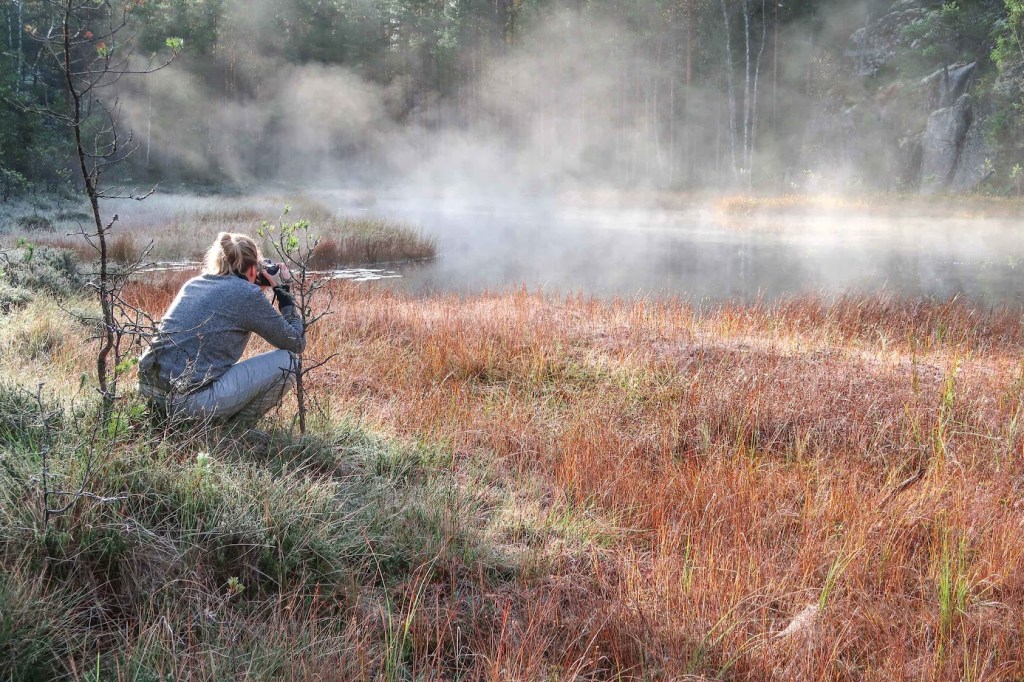 Nousin takaisin kalliolle ja jatkoimme matkaa eteenpäin. Pienen matkaa vain, toiselle rannalle. Samaan aikaan aurinko saavutti lammen ja sai valkoisen usvan nousemaan sen ylle. Usva liikkui kaunein, nopein liikkein, puhalteli helmojaan sinne tänne, ja me seisoimme sitä katselemassa kuin ainoat ihmiset koko ylängöllä.