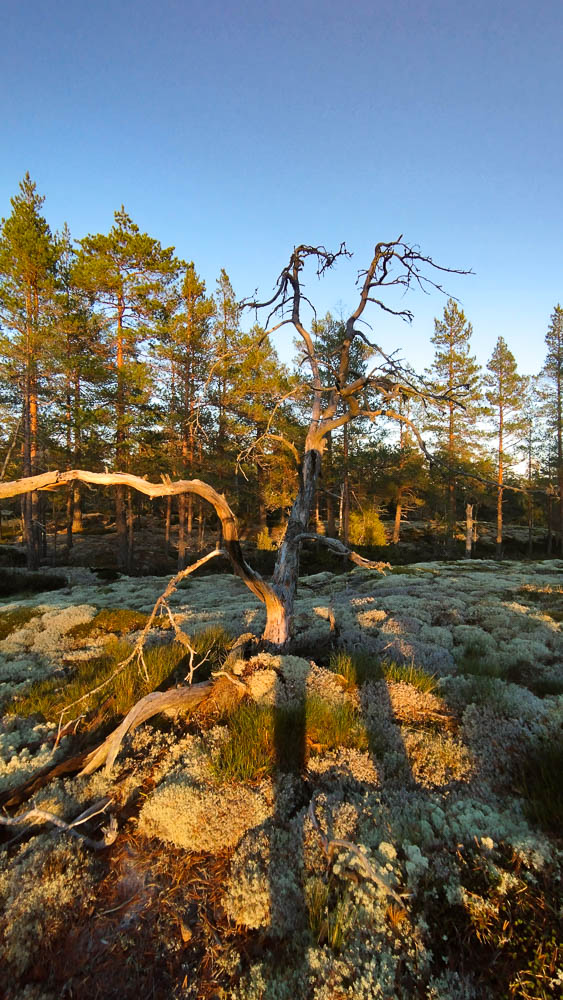 Vaikka alhaalla metsässä oli jo lokakuisen iltapäivän varjoisa hämy, mäki oli niin korkea, että kirkas aurinko paistoi minulle lähes koko matkan. Sen valo tuli luokseni mäntyjen ja kelopuiden lomitse, lämmittikin hieman, ja häikäisi ihanasti silmiä – tunne, jota Lapin talvissa välillä kaipasin. Aurinko heitti varjoni kallion sammalille ja puiden kylkiin. Varjo kulki uskollisesti mukana koko matkan mäen harjanteella.