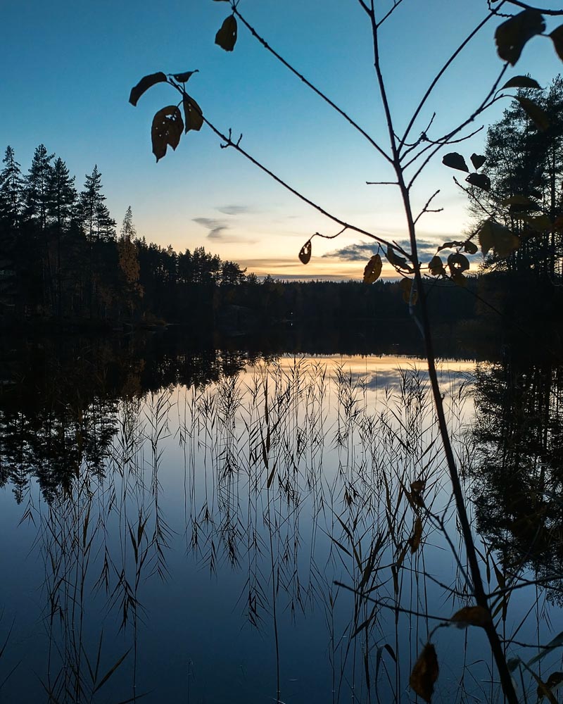 Puron vastarannalla kohosi eheä sammalkuusikko, joka lohdutti puupeltojen jälkeen. Tupsahdin pikkuruiselle heinää kasvavalle tielle, jonka luulin olevan Tynnärlammentien viimeisiä rippeitä, mutta kas vain, se olikin yhä Ruonantie. Nopea vilkaisu karttaan paljasti, että olin edelleen väärässä suunnassa. Onneksi kartta paljasti myös, että juuri tuo äsken tapaamani puro olisi tieviittani. Harpoin kuusimetsän poikki puron ääntä seuraten vain pienen matkaa, ehkä sata metriä, ja tulin oikealle tielle. Siellä minua oli vastassa iltaan jo pukeutunut peilityyni Tynnärlammi.
