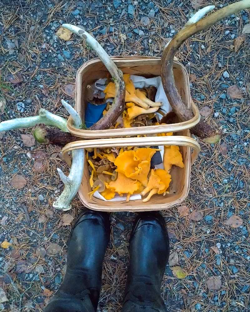 Puoliso tuli minua tietä pitkin vastaan. Katsaus koriin paljasti, että sarvien lisäksi oli metsästä löytynyt myös melko suuria kantarelleja.