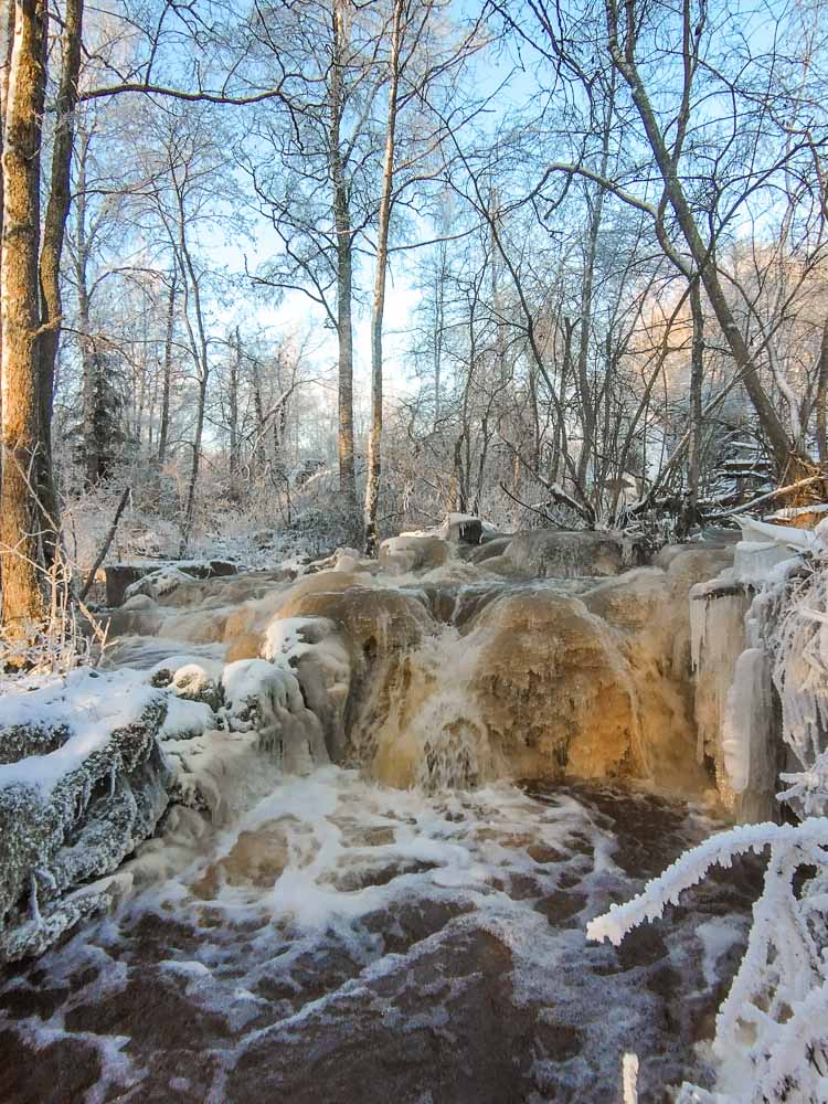 Putous oli jäätynyt enemmän kuin osasin arvellakaan. Hienosti kuohui silti yhä, ja puolenpäivän aurinko valaisi sitä talvisen lehdon läpi suoraan edestä.