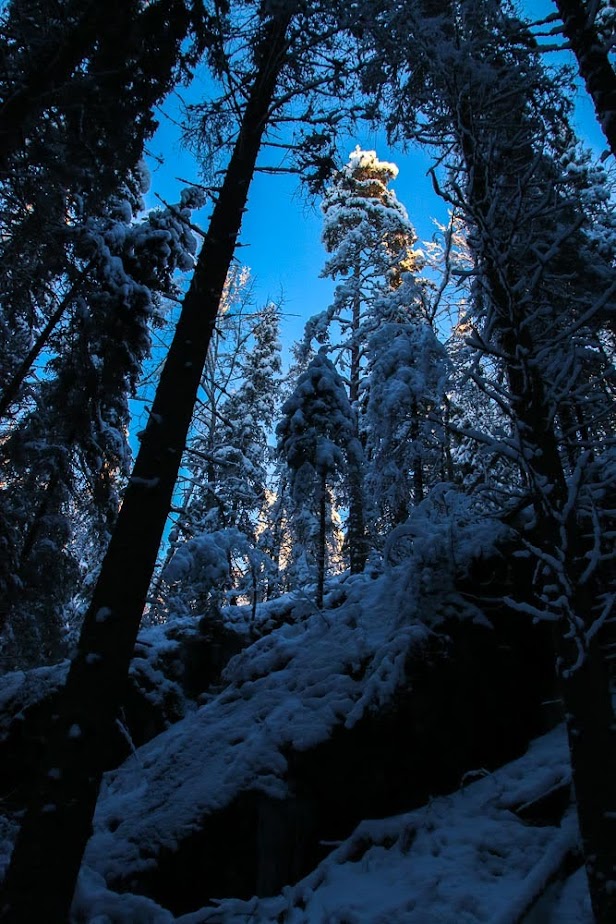 Iltapäivä oli kirinyt sen verran pitkälle, että sinisyys oli ehtinyt metsään jo meitä ennen. Aurinko kultasi kuusikon latvat tavalla, joka pellolta nähtynä näytti sinistä taivasta vasten lumoavan kauniilta, mutta metsän sisässä oli luonto jo kietoutunut siniseen hämärään, ja valo pilkahteli vain korkealla kuusien latvoissa, kuusikon korkeuksissa roikkuen ennen kuin katoaisi kohta kokonaan.