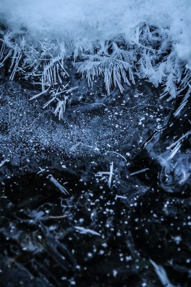 Purolle halusin päästä. Halusin nähdä ja kuulla, miten sillä menee. Lähestyessäni alkoi korviin virrata vuolaan veden ääni, ja se teki minut heti onnelliseksi. Valkoiseksi muuttuneen metsän ja sinne tänne kaatuneiden kuusien lomasta löysin tutun puron. Se oli kauttaaltaan jääkannen alla, mutta veden voimakas ääni kertoi, että virtaa riitti. Monin paikoin ei lumivaippa paljastanut purosta silmille pientäkään vihjettä, mutta parissa paikkaa jään kansi oli paljaana, ja sen alla solisi ja kuohui upea, voimakas puron vesi, jonka kirkas jää kauniisti paljasti.