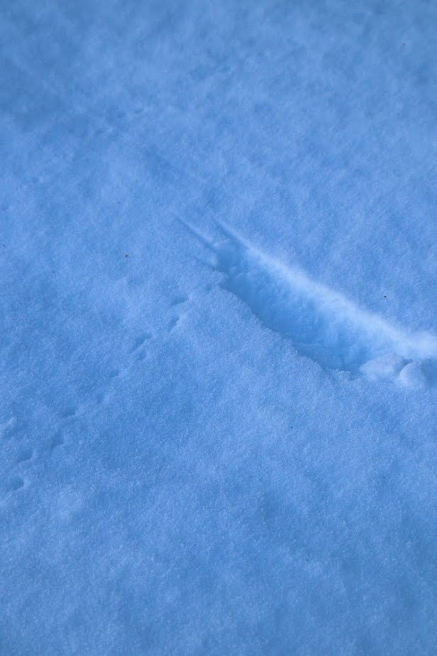 Auringon laskiessa laskeuduimme pois metsän rinteestä. Pitenevät varjot paljastivat pellolta monenlaista jälkeä, myyrien reikiä ja lintujen siipien jälkiä.