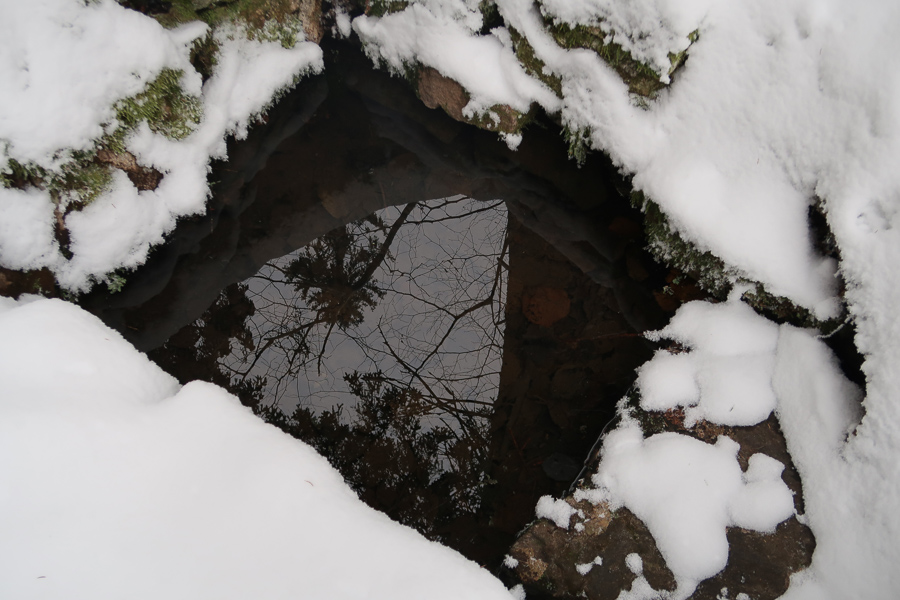 Reitin varrella oli kivin reunustettu lähde. Ihana sula vesi, kuin tervehdys kesältä. Pitkosten alta liristen lähteen vesi oli valunut alemmas metsän rinnettä ja muodostanut mustan, levenevän hunnun vitivalkoiseen hankeen.