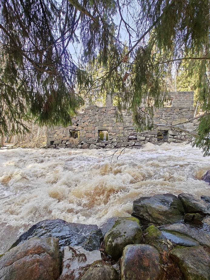 Kotiin emme palanneet suorinta reittiä Mustion tai Kosken kautta, vaan poikkesimme vielä Latokartanonkoskella kiertämässä tutun, lyhyen rengasreitin. Koski oli täynnä vettä ja kävijöitäkin oli jonkin verran. Kuljimme reitin rauhassa, paikan jylhyys jaksaa aina hämmästyttää vaikka siellä on käynyt jo niin monesti. Pysäköintialueella oli edelleen isot läjät eri kokoisia kiviä, joista varmaankin joskus rakennetaan kaloille mieluisaa kutuympäristöä.