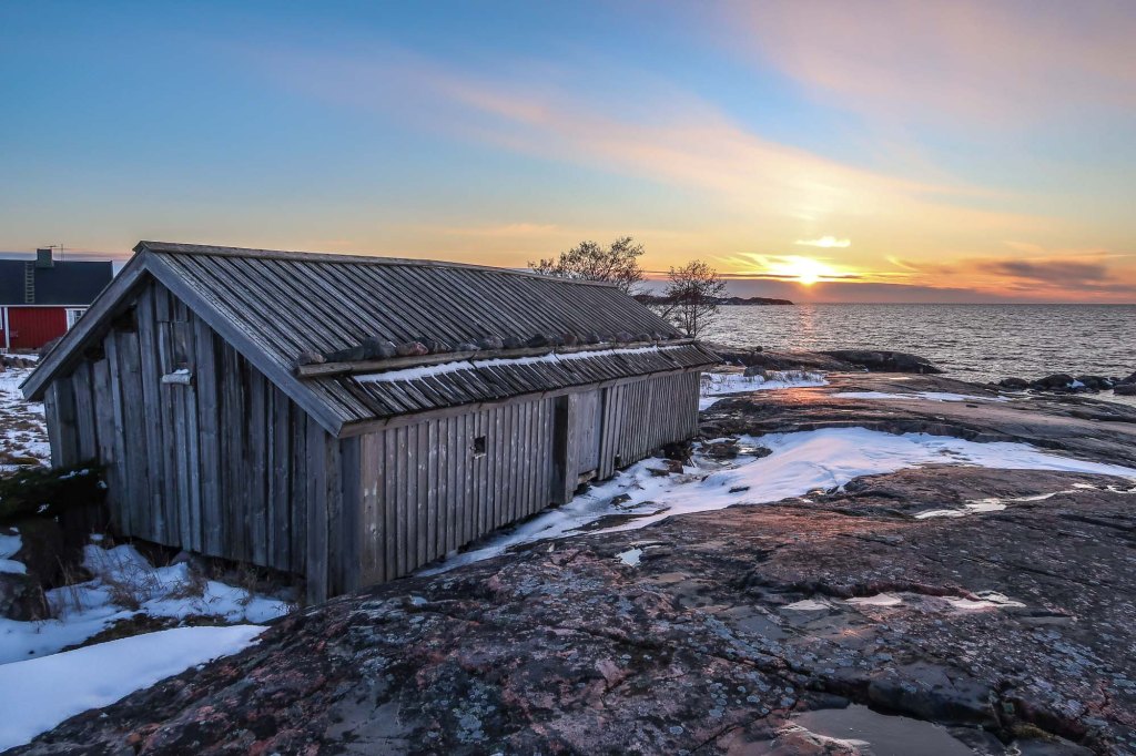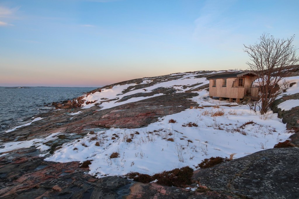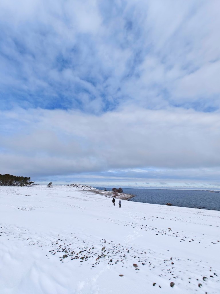 Lounaan ja päiväunien jälkeen muu seurue jäi vielä lepäilemään, mutta itse en pystynyt pysymään sisällä, sillä aurinko paistoi siniseltä taivaalta vastoin optimistisintakaan sääennustetta. Lumi suli niin että kihinä melkein kuului. Kävelin Jurmon kylätietä kohti satamaa ja nousin Högbergetille tähystämään, missä olisi tuulettoman näköistä rantaa.