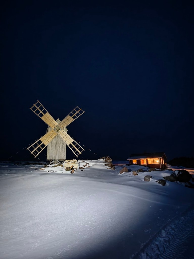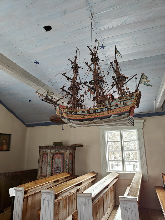 Aamulla saimme todella nähdä takatalven saapuneen kanssamme saarelle. Lunta oli paikoin kinoksissa polviin saakka ja taivas pilvinen. Lähdimme pienelle kävelyretkelle, mutta se oli hankalaa, kun reitit olivat ummessa. Ensin poikkesimme sisällä valkoisessa kauniissa kappelissa.