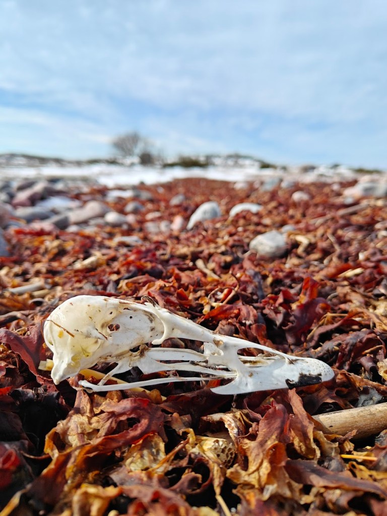 Päätin kulkea sataman ohi kansallispuiston telttailualueen seudulle. Siellä sain ihailla rantaan huuhtoutuneiden levien värejä ja niiden tuoksua, joka on minulle todella rakas Saaristomeren tuoksu. Haahkan paperinohut kallio lepäsi punaisella matolla, jätin sen siihen.