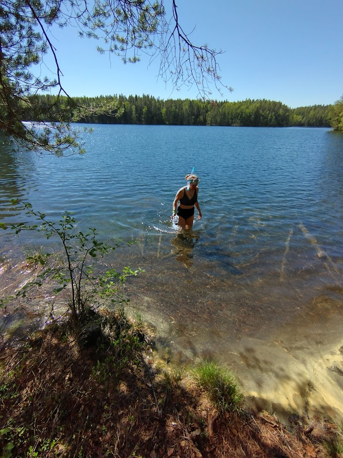 Kuten viime vuonnakin, kesän ensimmäiseksi snorklauskohteeksi valikoitui Iso-Valkee. Muun muassa siksi, että meillä oli muutenkin asiaa Somerolle, mutta myös siksi, että kun vesi uhkaa olla viileää ja edellisestä kerrasta on pitkä aika, niin on kiva, että ranta on tuttu. Se on yksi jännitystekijä vähemmän kun tietää, mihin on menossa ja millaista siellä on.