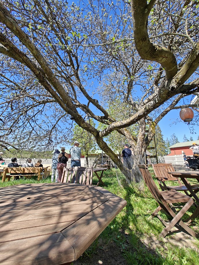 Ajelimme paikalle Someron maaseudun halki ja siirryimme muiden sikakummien kanssa puutarhaan odottamaan varsinaisen vierailun alkamista. Puutarhan kioskissa oli myynnissä munkkia ja muuta herkkua, mikä näyttikin uppoavan yleisöön varsin hyvin auringon paistaessa suoraan suurien omenapuiden koristamaan toukokuiseen puutarhaan.