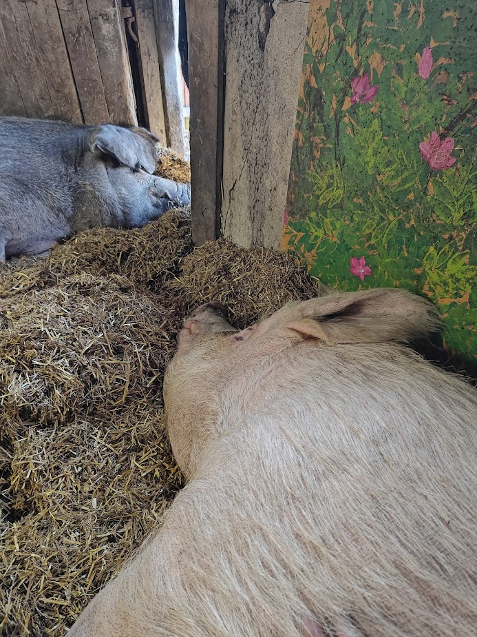 Sisällä kiipesin vielä toisenkin metalliportin yli. Siellä makasi portin edessä villisika, ja lähempänä ulos johtavaa luukkua kaksi sikaa lisää, kauniin kukkateemaisen huoneen pehmeällä heinäpedillä. Kaikki olivat sikeässä unessa eivätkä tuntuneet laittavan läsnäoloamme pahakseen – hyvä jos olivat sitä vertaa hereillä, että tiesivät meidän edes olevan siellä. Ja hyvä niin, tärkeintä on, että he saivat rentoutua vierailupäivänäkin parhaaksi katsomallaan tavalla. Hoitajia oli alueella ja sikojen luona paikalla useampi kertomassa eläimistä ja pitämällä silmällä kaiken sujumista ja rauhaa.
