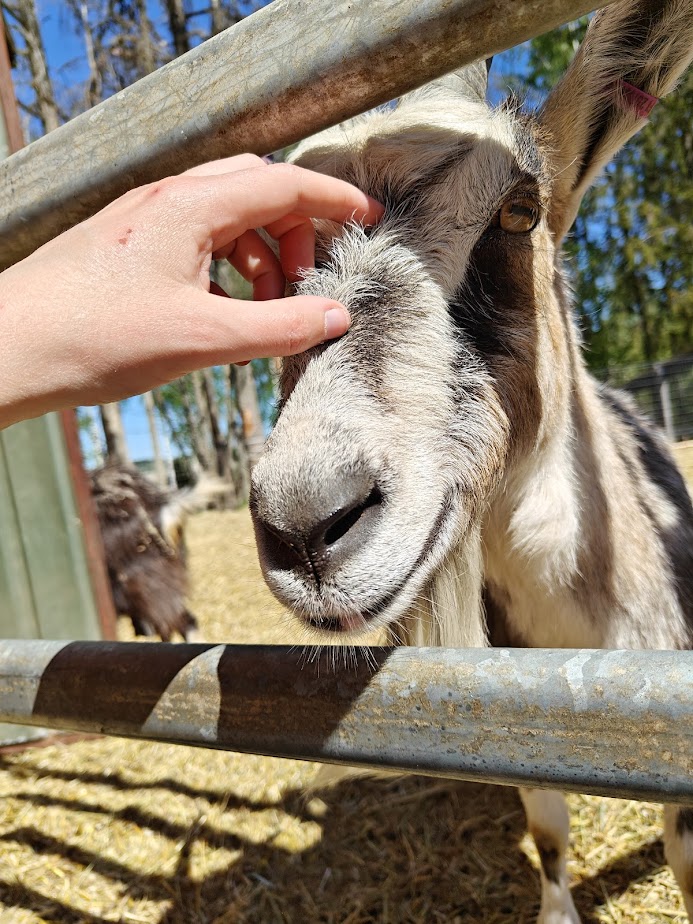 Kun sitten oli aika siirtyä isoja sikoja katsomaan, ihmiset jakaantuivat pariin eri leiriin – osa suoraan sikojen luo, osa rapsuttamaan vuohia odotellessaan omaa vuoroaan. Minä menin ensi vuohien luo toivoen, että suurempi väkimäärä kohta haihtuisi sikojen luota ja saisin tavata heitä enemmän omassa rauhassa. Tuulispäässä on myös mm. turkistarhoilta pelastuneita kettuja, joiden näimme loikoilevan kauempana varjossa omassa tarhassaan.