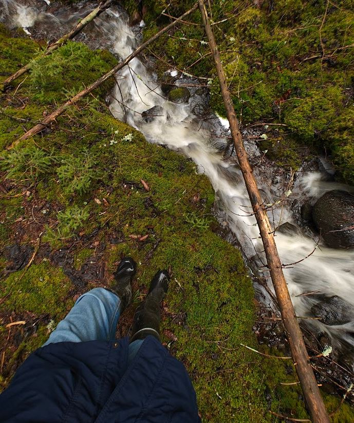 Ylitin jälleen yhden heinää kasvavan metsäautotien, jonka toisella puolella kuusikkoinen alamäki johdatti minut sammalta kasvavaa maata halkovan, hiekkapohjaisen puron ääreen. Puro virtasi syvällä uomassaan ja mutkitteli kauniisti – tämä on minulle tuttu paikka, ja tunsin helpotusta. Katselin puron virtaa ja mutkia ja kuuntelin sen solinaa. Pidin seisaaltaan pienen evästauon, ennen kuin ylitin puron ja lähdin nousemaan jyrkkää rinnettä ylös.