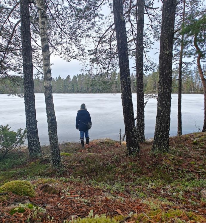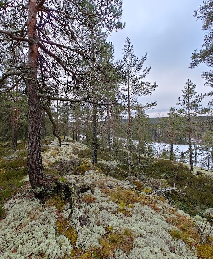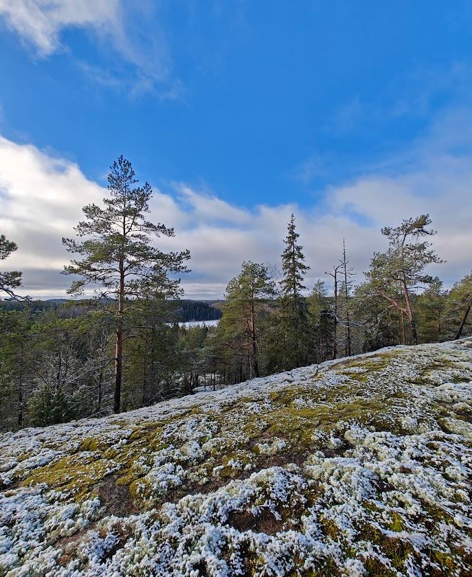 Seuraava järvi pilkisti esiin puiden takaa. Muistan olleeni sen rannalla kuusikossa joskus sienestämässä. Ihmisistä ei ollut tietoakaan, vain korpin ääni kiiri taivaalta metsien ja järvien ylle. Pilvet liikkuivat nopeasti ja saatoin arvata, että aurinko ja vanha taivas olisivat näkyvissä vain hetken aikaa. Olin iloinen, että tuo hetki oli osunut juuri tähän, kun olin juuri tämän mäen laella. Ohut lumikerros, vanha metsä kallioisessa maastossa ja auringon valo loivat niin hienon maiseman yhdessä.
