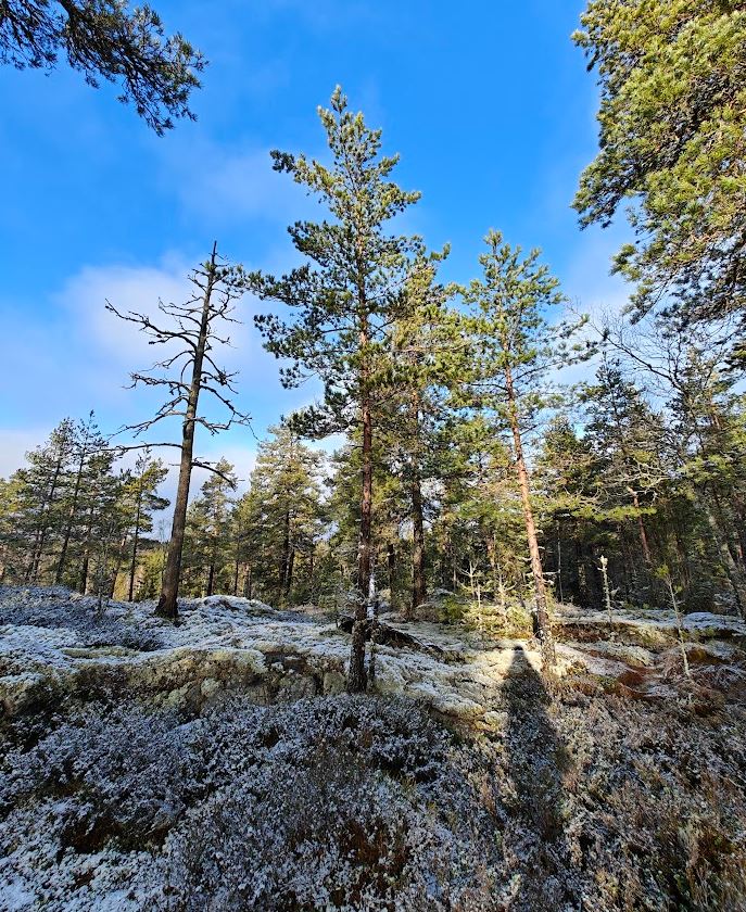 Kallion juurelta tupsahdin hiekkatielle ja kuljin sitä pitkin ehkä sata metriä. Sitten alkoi nousu seuraavalle ja samalla viimeiselle mäelle. Hikinen nousu se olikin, hankalaa ja jyrkkää puuviljelmän rinnettä ylös, mutta laelle päästyäni maasto oli vanhaa luontoa ja helppokulkuista. Mietin, ovatko jotkut näistä männyistä seisseet täällä jo silloin, kun isi on nuorena kuljeskellut tällä samalla mäellä. Osa puista oli vänkyröitä ja kilpikaarnaisia, hyvinkin voisin uskoa niiden olevan iäkkäitä.