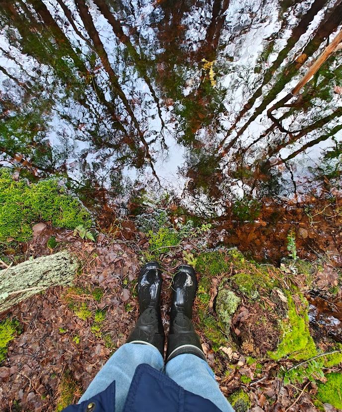 Tiellä ei näkynyt ketään. Oli täysin hiljaista, ja tuntui hauskalta tupsahtaa sinne kuin keskeltä ei mitään. En ollut koko matkan aikana nähnyt ketään, enkä nähnyt nytkään. Hyvä niin. Lorkin tien yli vastapäiseen metsään etsimään isin leikkipaikan, joka pienen haun jälkeen sitten löytyikin. Toisin kuin kesällä, nyt sen pohjalla seisoi vesi.