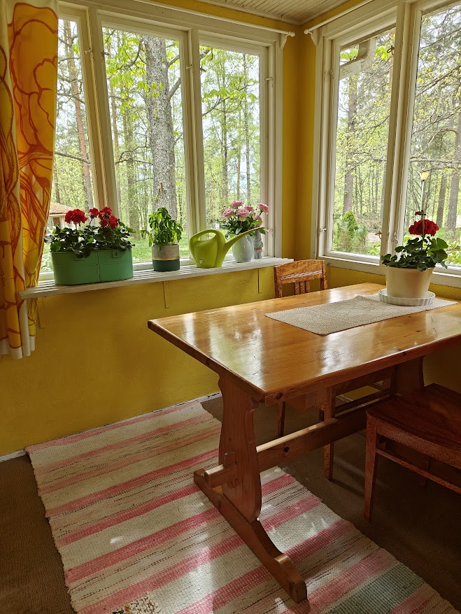Kylmäeteinen sai uuden kirkkaammankeltaisen maalikerroksen vanhan haaleankeltaisen päälle. Pirttipöytä löytyi liiteristä, matto on mamman kutoma ja tuolit saimme tädiltä. Verhot ovat kirppislöytö noin 15 vuoden takaa.
