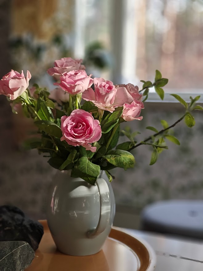Äidin tuoma ruusukimppu olohuoneessa.