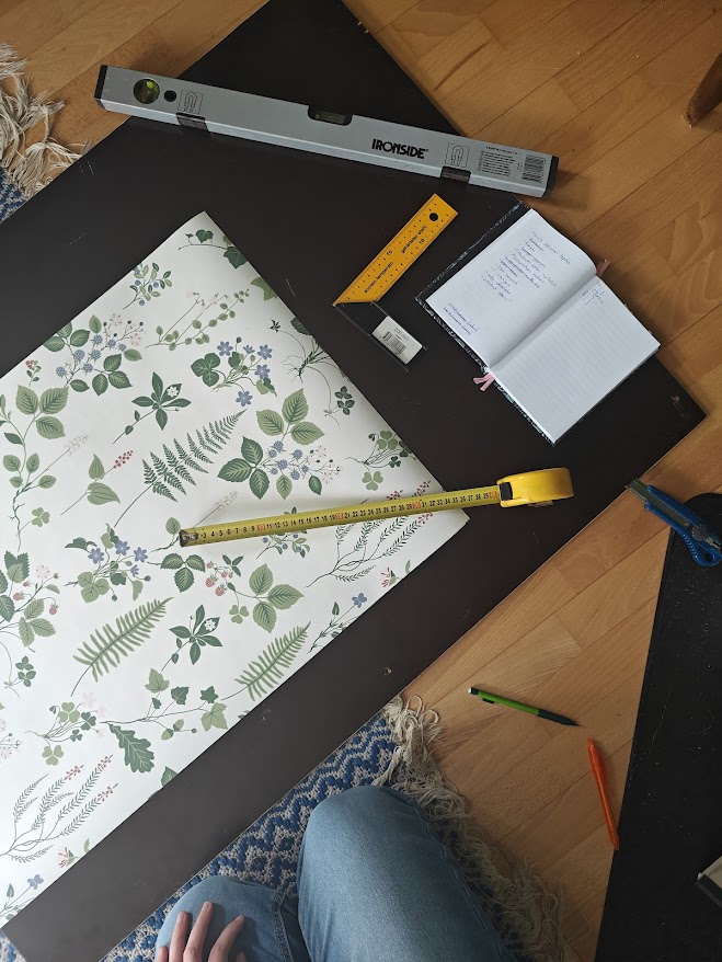 Alennusmyynnistä löytyi kaunista tapettia noin 20 eurolla per rulla. Ostin viisi rullaa, joista riittää vielä makuuhuoneenkin tapetoimiseen jonain kauniina päivänä. Tapetointi oli tahmeaa, vasta loppuvaiheessa sain taas kunnolla kiinni siitä, että miten kaikki kannattaakaan kätevimmin tehdä.